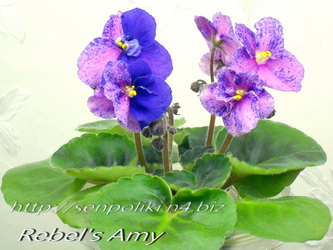 Rebel's Amy (9281) 11/12/2003 (R. Bann) Single-semidouble pink pansy/purple fantasy. Dark green, quilted, glossy, scalloped girl foliage. Semiminiature